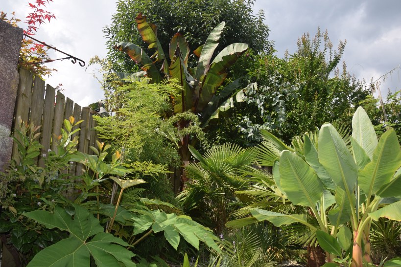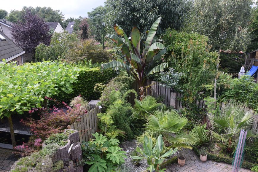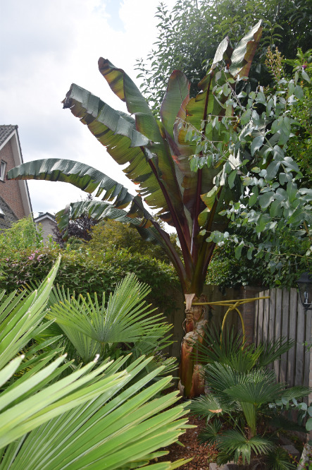 Steeds gedacht dat ze beter tussen en onder andere planten of bomen staan zodat ze meer gaan strekken op zoek naar licht. Enkele blikken op jullie foto's leert al snel dat ze zowat bij iedereen in de openlucht/volle zon staan dus dat verhaal gaat ook niet op. Aan de grond ligt het ook niet. Sinds twee jaar een ander huis en tuin en ook hier willen ze gewoon niet. Enkele jaren terug een exemplaar van Rob over genomen. Die paste destijds amper rechtop door het huis en had eerder een lange dunne stam als een basjoo. Gezien Robs volle tuin vermoedelijk toch een exemplaar geweest welke op zoek was naar licht. Nu nog altijd een erg mooie plant maar qua hoogte zou ie zo door het huis kunnen. Breedte zal niet lukken zonder schade.