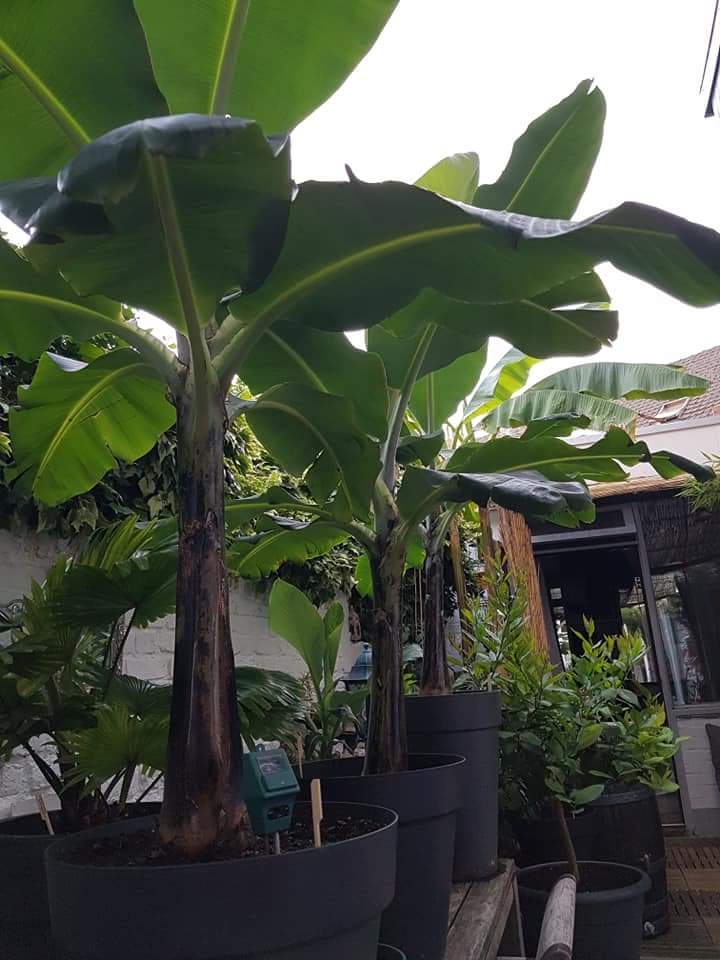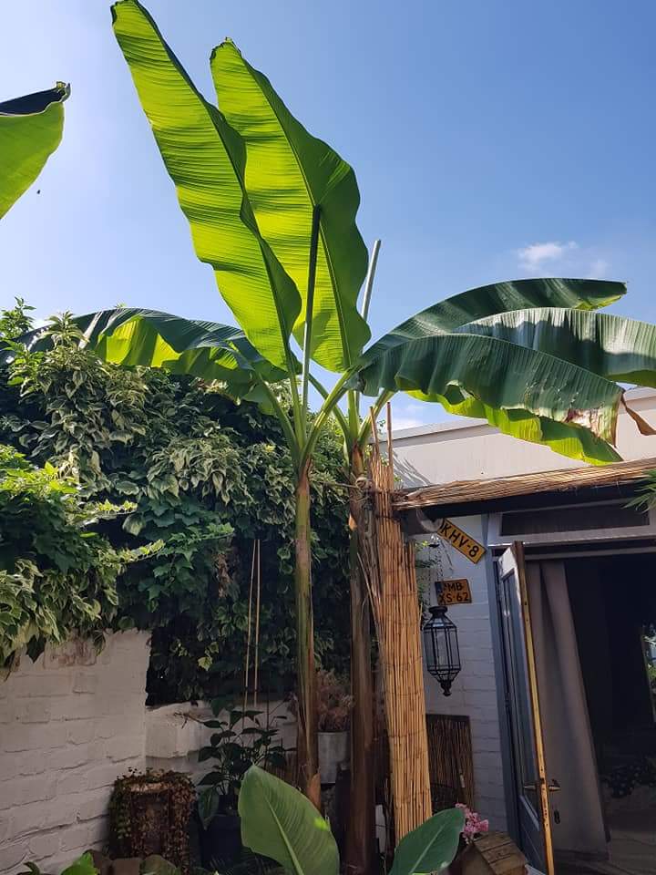 Super hoe de Cavendishes groeien in dit warme weer! Weer een waaier eruit! Stamlengte = 80 cm, totale hoogte plant 170 cm + pot 2m!! Met bladeren van 90 x 50 cm al