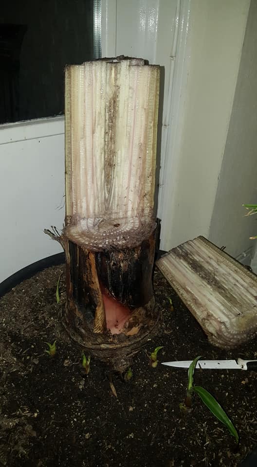 De Pokon plant heb ik helemaal afgetopt. Zon 10 cm onder de kruin. En vandaar een paar buiten lagen lager af gesneden, zodat de kern eruit kwam.