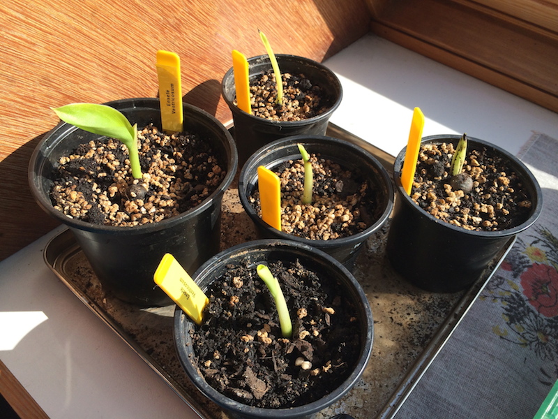 Het bakje met zaden is weggelegd op de verwarmingsketel in de kelder met een temperatuur afwisselend tussen de 20 en 35 graden. Na 17 dagen kwam de eerste al boven. de dagen erna volgde de rest. De opkomst is 100% :thumb_up: