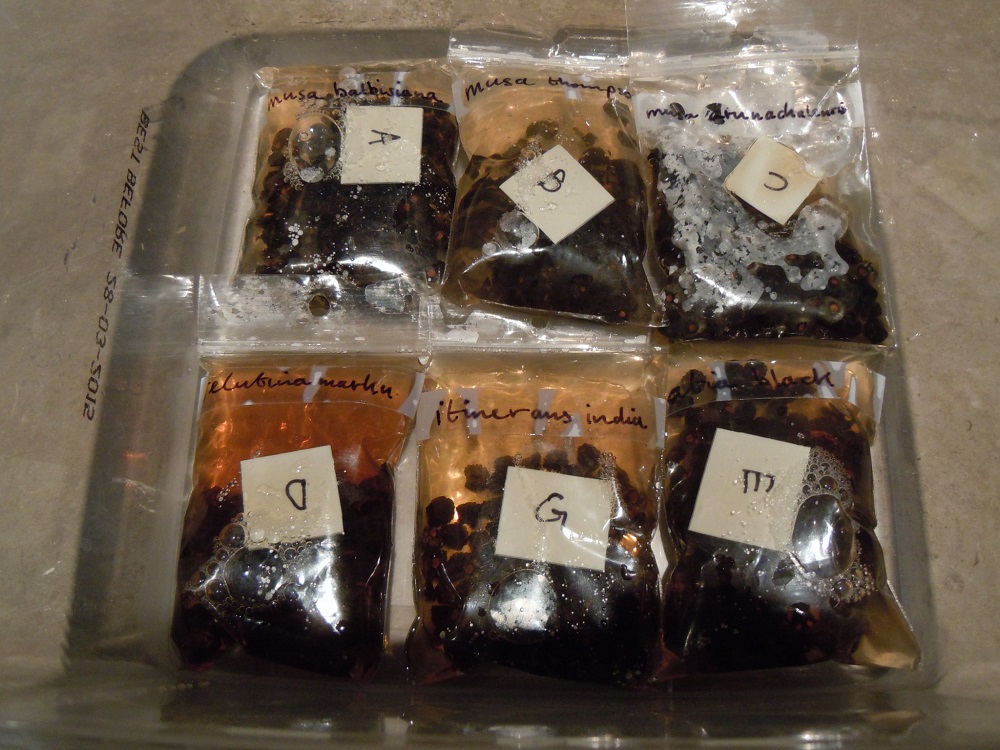 Daarbij ga ik ook de zaaibakken van vorig jaar opkuisen, naar binnen halen (die staan nog steeds in de kas als soort van koudeprikkel) voorzien van verse cocospeat en weer lekker warm weg zetten. Ervaringen uit voorgaande jaren bewezen wel degelijk dat banaanzaden zelfs na meer dan een jaar nog massaal kunnen kiemen dus we gaan er weer voor. Onderstaand de foto's van de binnengekomen zaden plus een soorten lijstje. De zaden zijn overigens net vers binnen gekomen uit India.