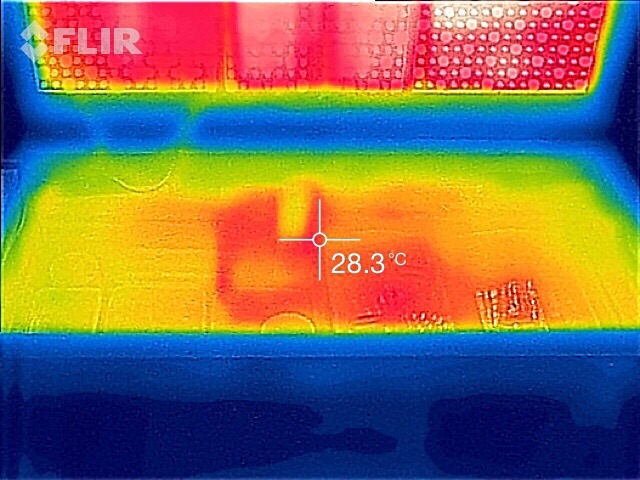Hierboven het warmtebeeld van de geopende kweekbak. Duidelijk is te zien dat de ledpaneeltjes zelf ook best veel warmte produceren. De dunne witte lijntjes geven wat zaaibakken weer.