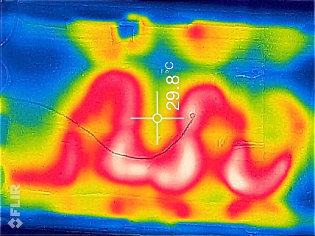 Bovenstaand het warmtebeeld van de bodem van de kweekbak waar je duidelijk de warmtekabel (rood/wit) in s-bochten ziet lopen met zijn uitstraling. Het zwarte kabeltje is de temperatuurcensor-kabel welke op het zand ligt.