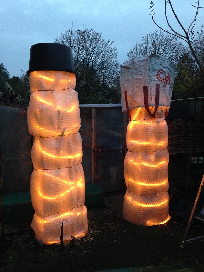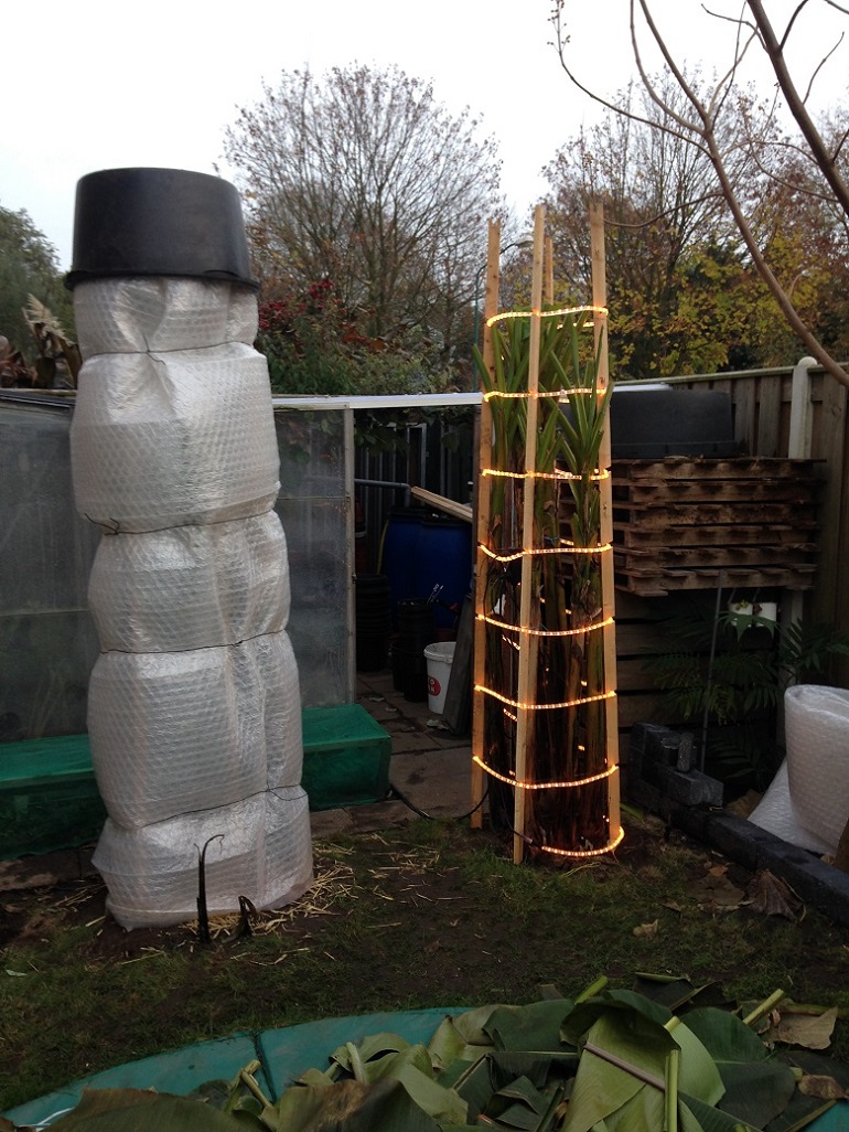 Twee a drie keer noppenfolie errond, speciekuip op de kop en klaar. De foto's zeggen genoeg. Evt nog wat blad onderin gooien om de voet van de plant te beschermen. Vanaf -2 doe ik de lichtslang pas aan tenzij het langdurig onder nul is, dan gaat het spul ook overdag aan.
