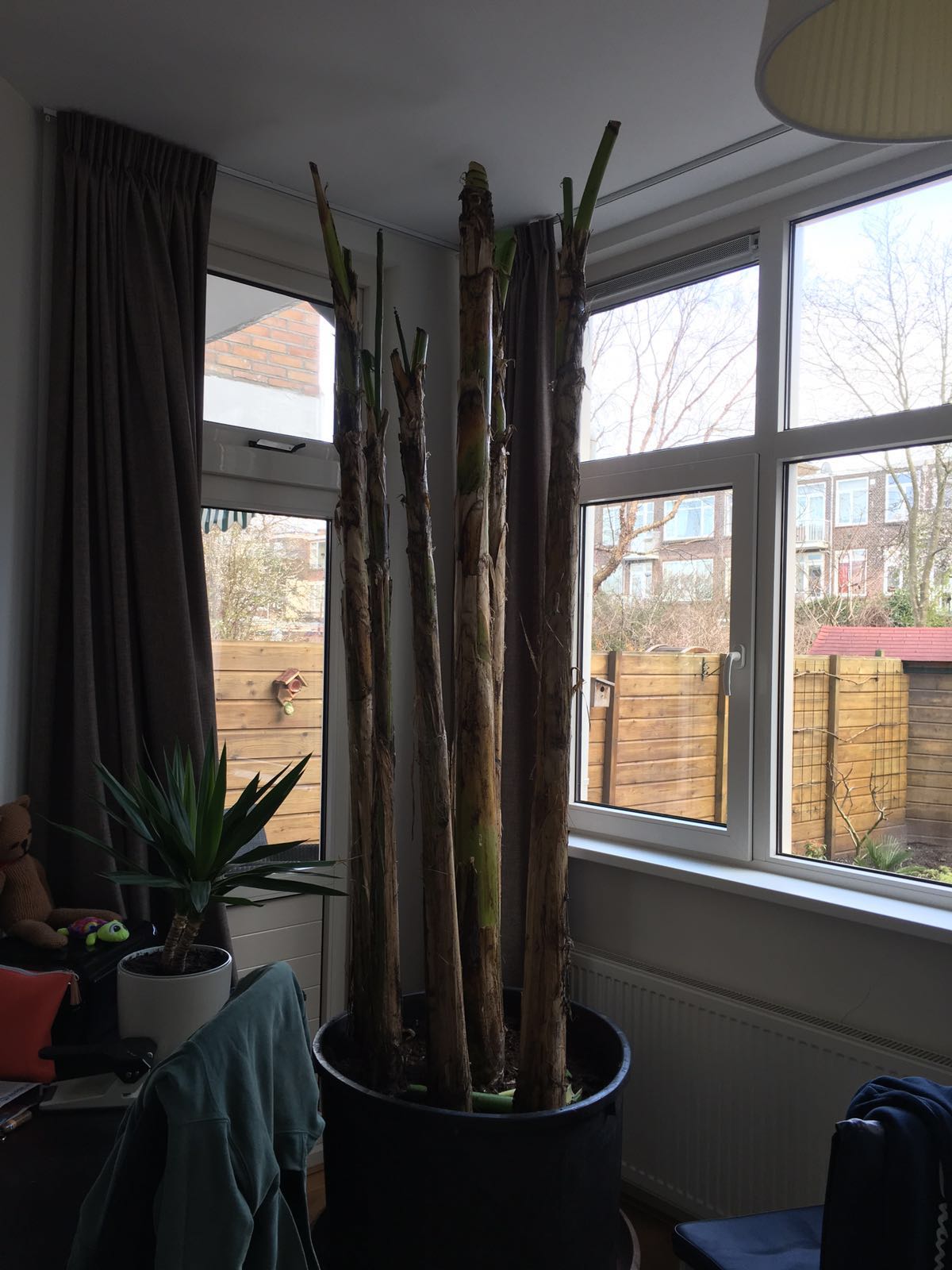 Ik ben stom geweest. Mijn trots: musa basjoo sikkimensis red tiger. Als 2 jaar haal ik hem met vee moeite en hulp van vrienden naar binnen en snijd ik de bovenkant eraf. Elke 5 dagen snijd ik de nieuwe groei eraf zodat deze niet tegen het plafond groeit zodat hij hopelijk een keer in bloei zou komen.