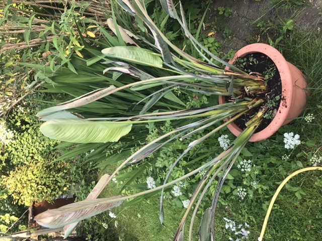 Ik heb eind April mijn Strelitzia naar buiten verhuisd, nu lijkt het erop dat de meeste bladeren afsterven. Ze worden donker en vouwen samen.