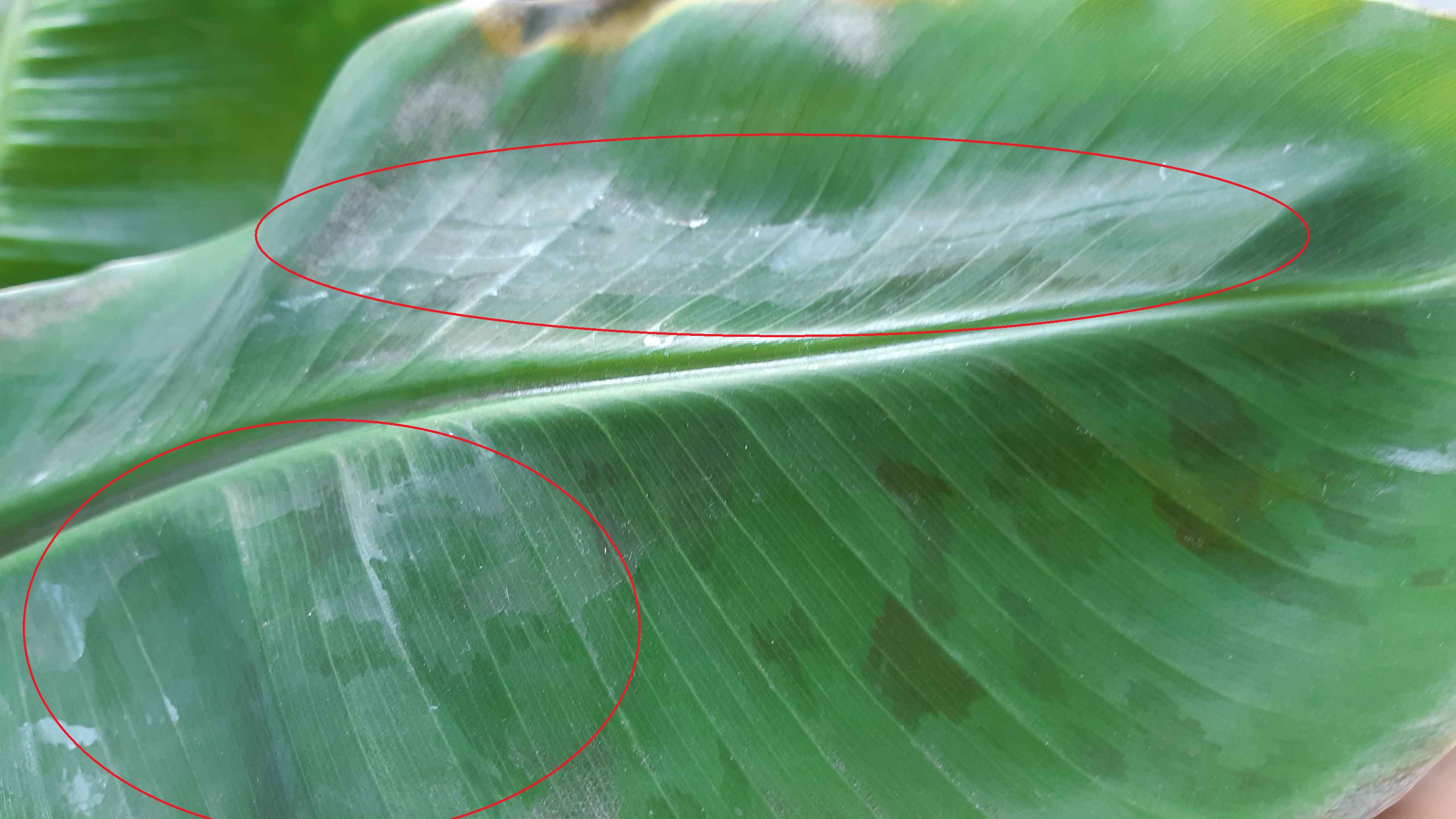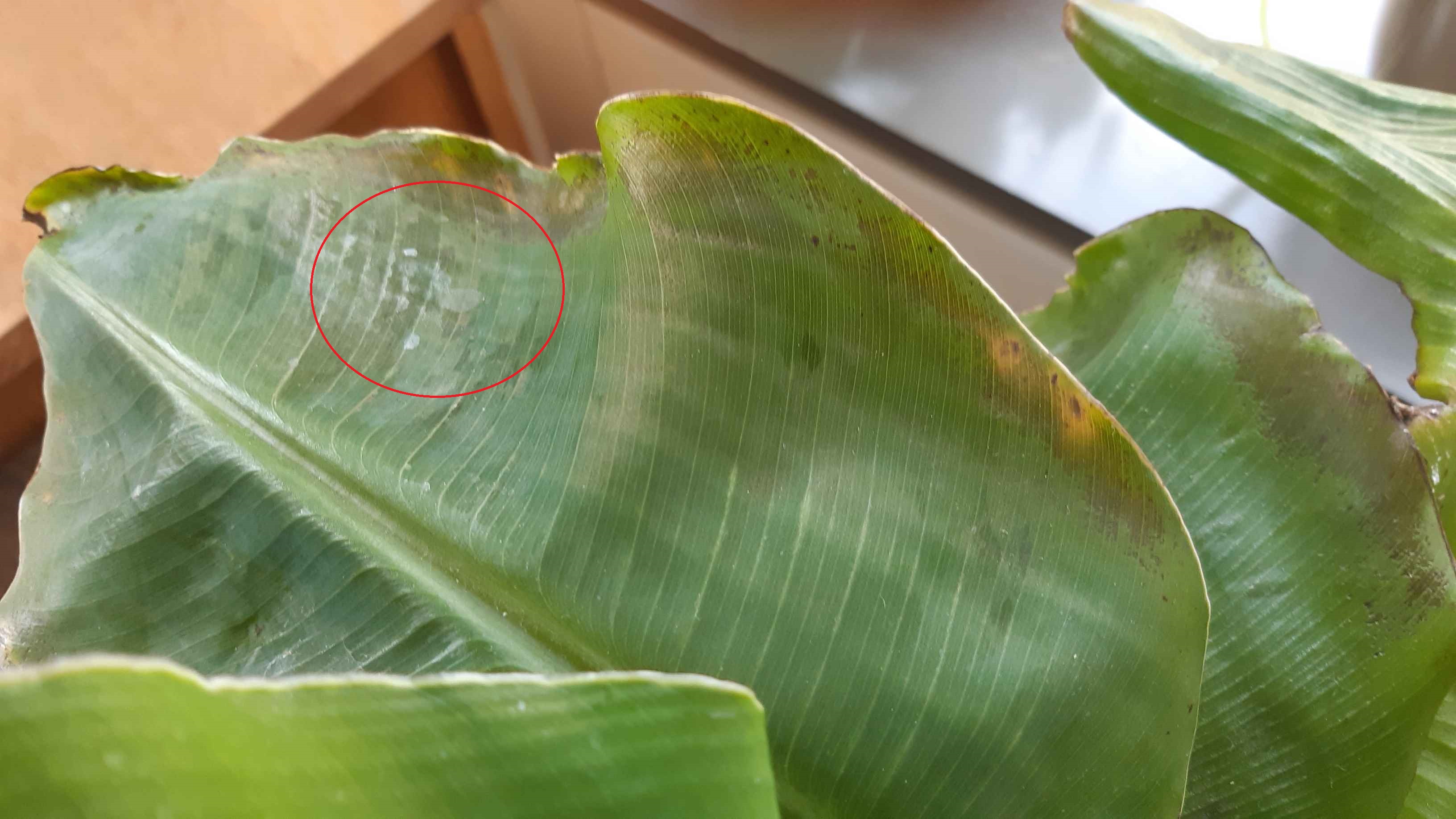 Ik heb witte vlekken op de bladeren van de musa ontdekt.(Rode cirkeIs op foto's)