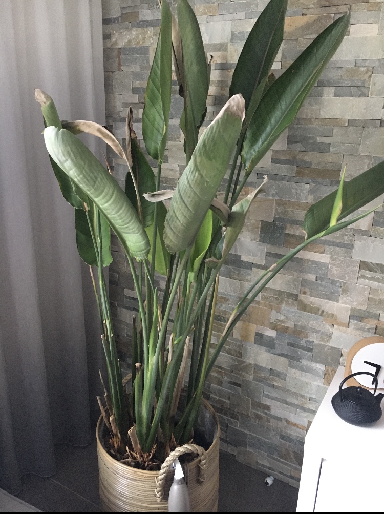 Afgelopen voorjaar deze Strelitzia gekocht en ik de zomer ging het goed. Hij staat binnen nog in de kwekerspot en die staat in een rieten pot.