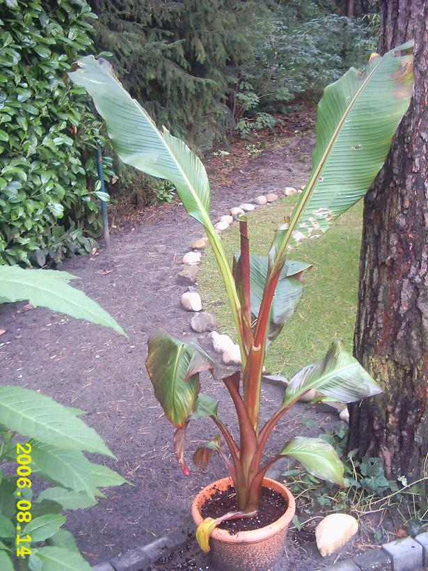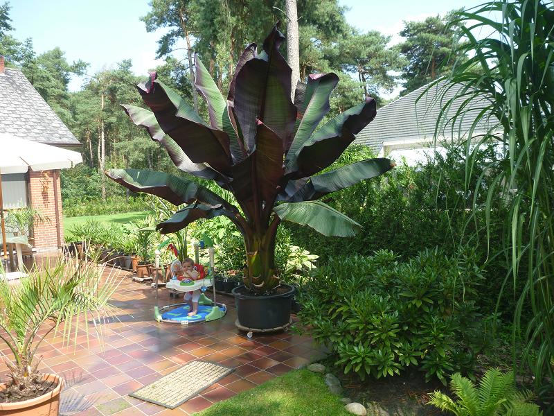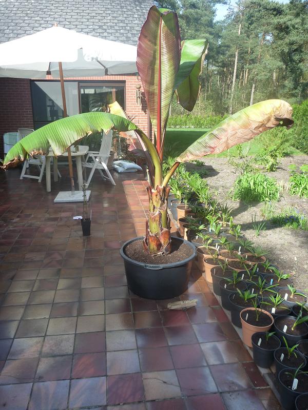 in de zomer van 2009 zijn alle bananen,hostas enz. verwoest door een nooit geziene hagelbui. Tegen half september hadden de bananen toch weer een paar mooie bladeren aangemaakt.