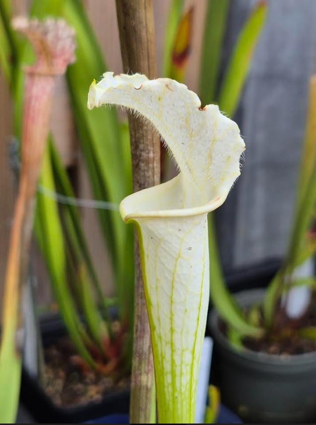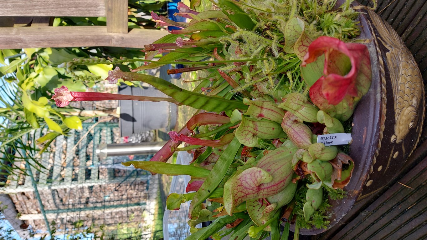 Sarracenia leucophylla en hybriden ontwikkelen de mooiste bekers in het najaar.