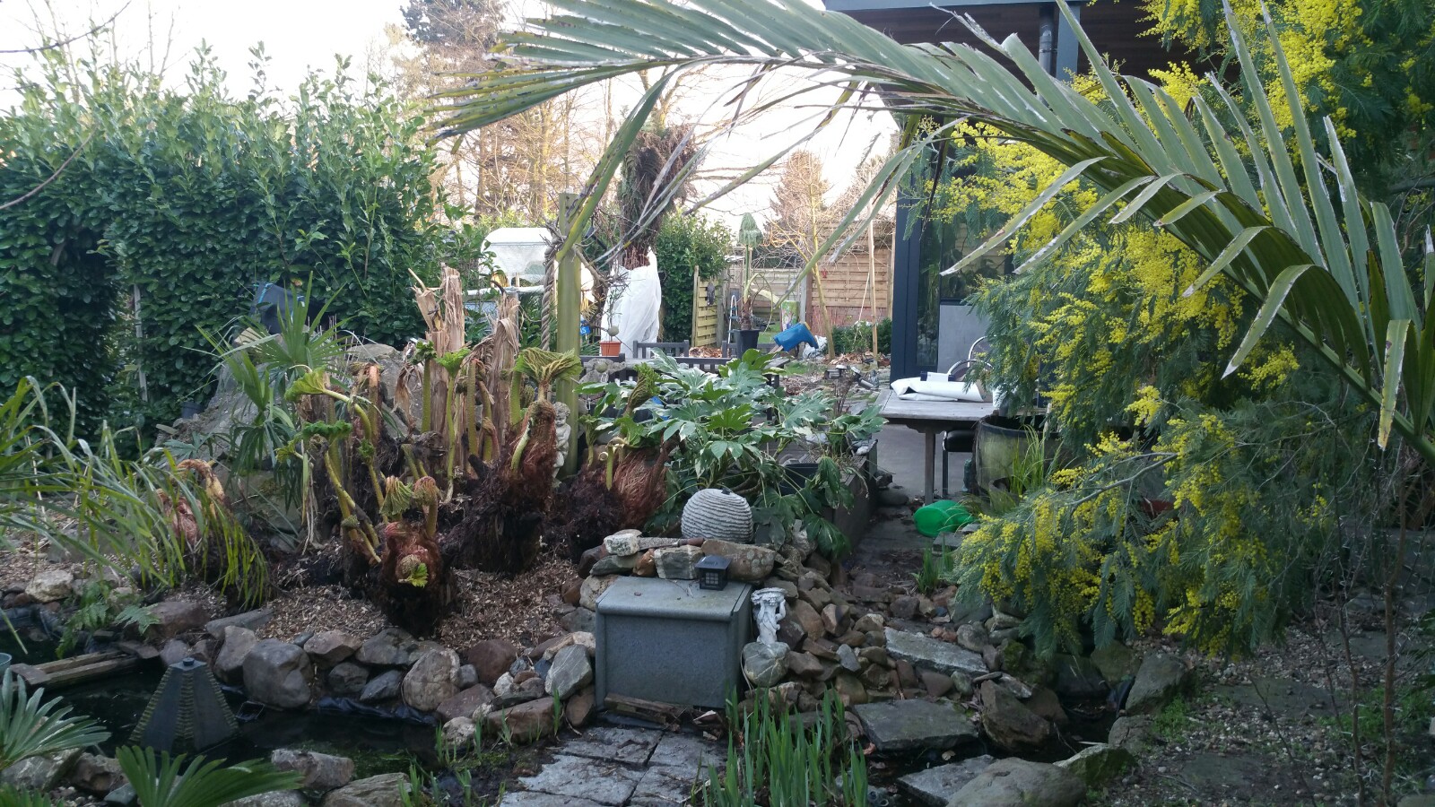 Graag had ik eens van jullie geweten, wanneer jullie de winterbescherming van een Gunnera Manicata verwijderen? Hier staat hij nog onder een bescherming.