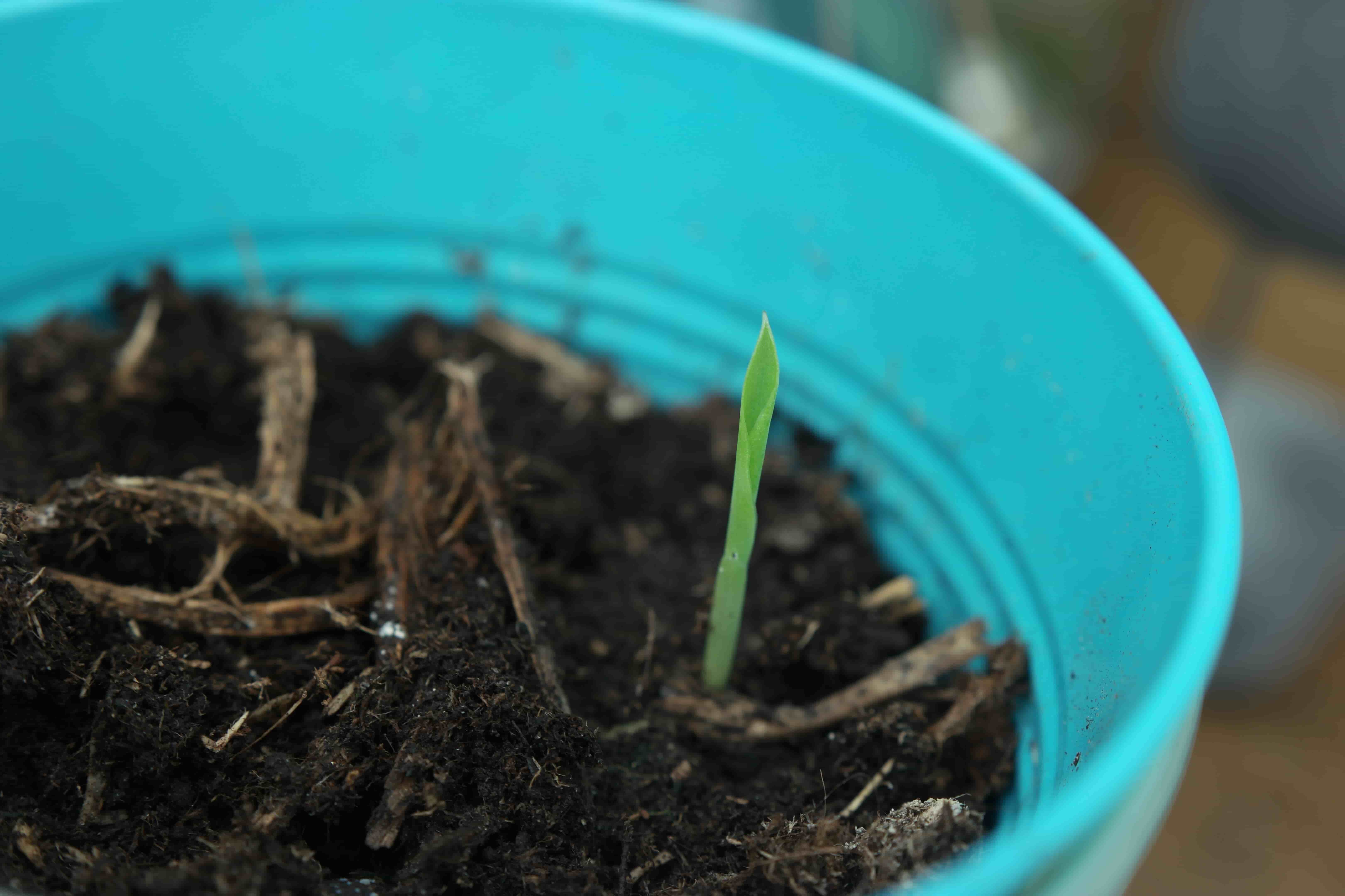 En dan nog een leuke verrassing gisteren: De banaan is opgekomen na ongeveer een maand! Het is een Musa acuminata, een wildere variant met zaden.