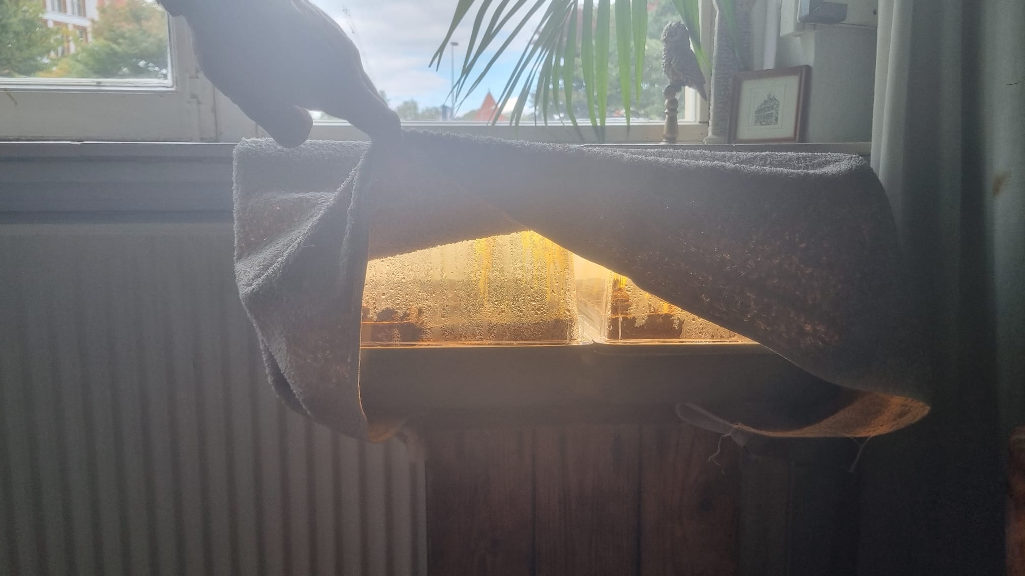 Voor het zaaien en stekken heb ik weer wat anders gefabriceerd. Een oud aquarium met een glasplaatje er op om de luchtvochtigheid vast te houden en een kastje met een verwarmingsplaatje er onder voor bodemwarmte.