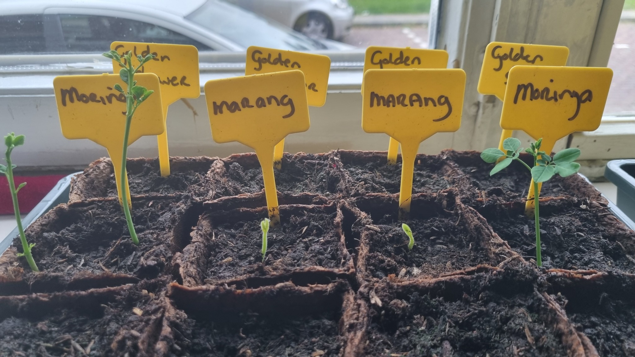 Dag Bonne, Zo te zien zijn het alleen de Moringazaden die ontkiemd zijn. De rest dus nog niet terwijl ze toch al bijna een maand in de grond zitten. De vraag is dan of ze nog gaan komen.