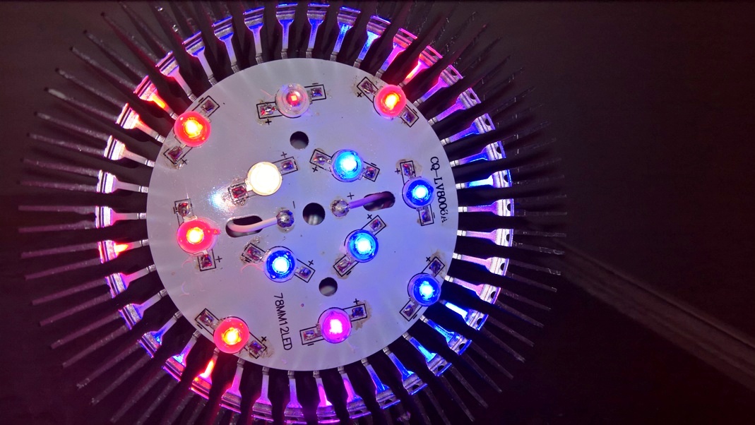 Je ziet twee soorten rood, blauw, ultraviolet, infrarood en wit. De afgebeelde lamp geeft veel geschikt licht en gebruikt toch maar 8 watt. Normaal zit er een kunststof lens op, maar die heb ik verwijderd voor meer rendement.
