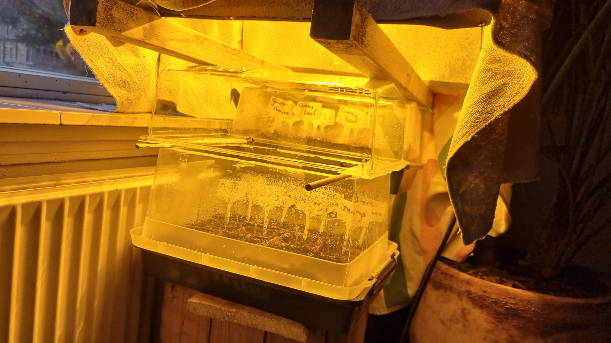 De zaailingen in de kast groeien mooi compact, dus het licht is voldoende. De kast is een simpele constructie van multiplex en wat latjes. Voor de ventilatie zitten er aan de zijkant wat roosters en in het plafond een paar oude computerventilators die op halve spanning draaien.