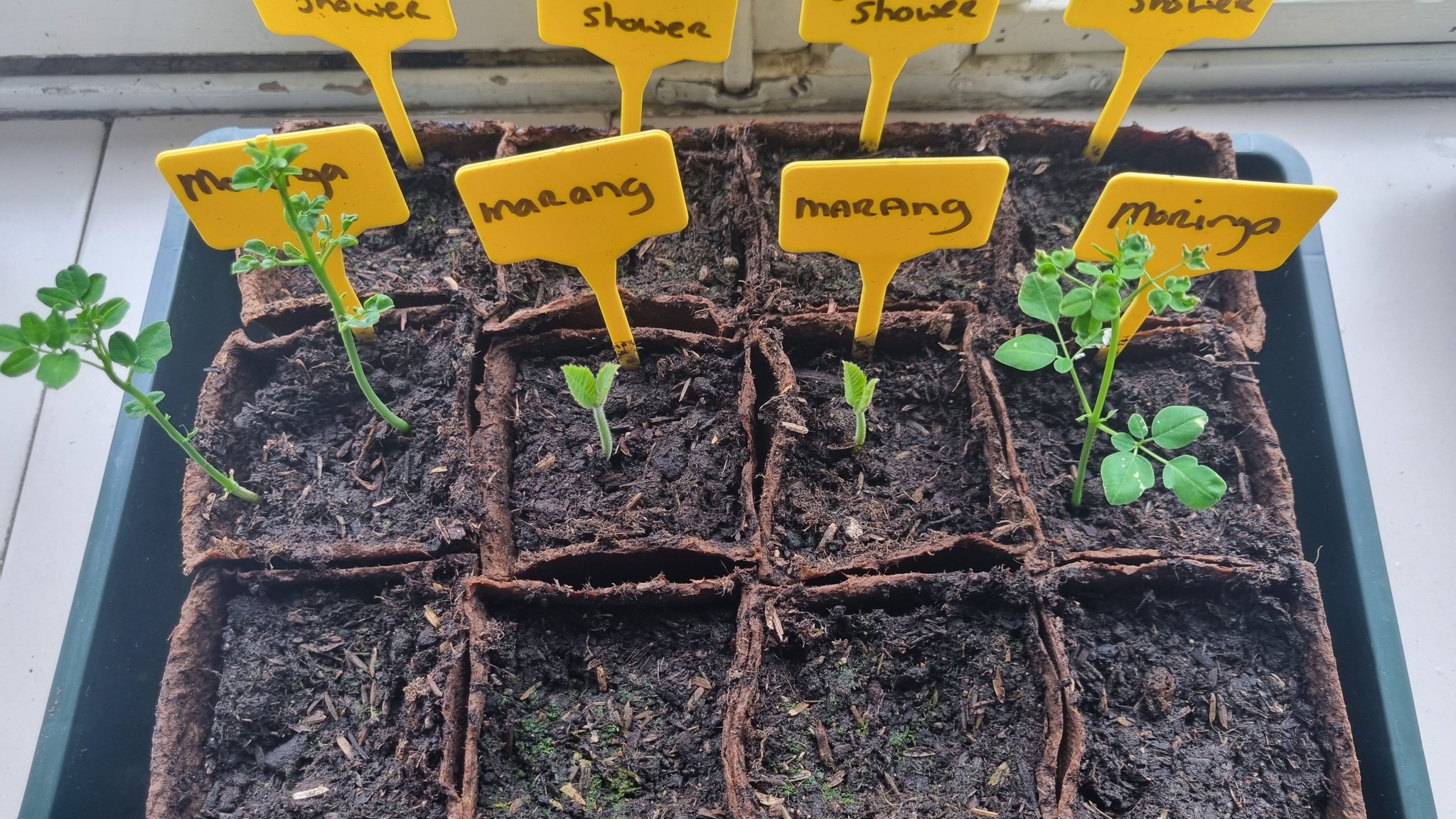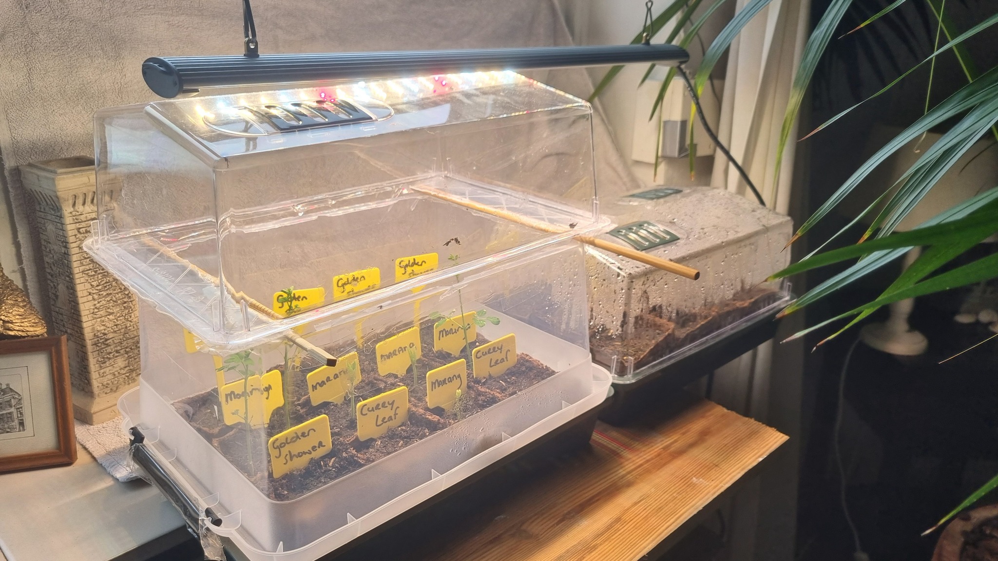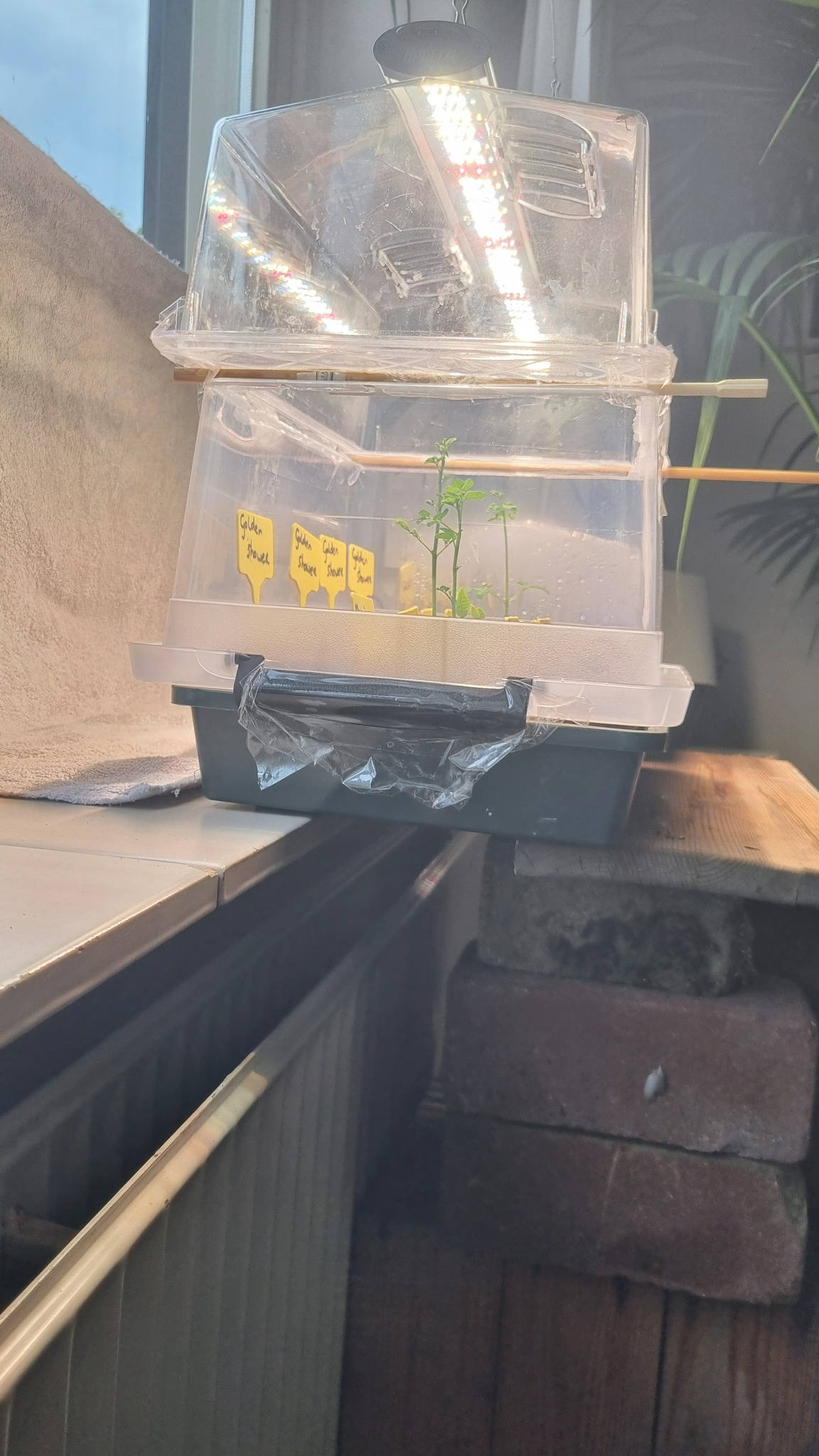 De zaailingen hebben nu een 2 uur in de kast gestaan met de deur dicht en licht aan.