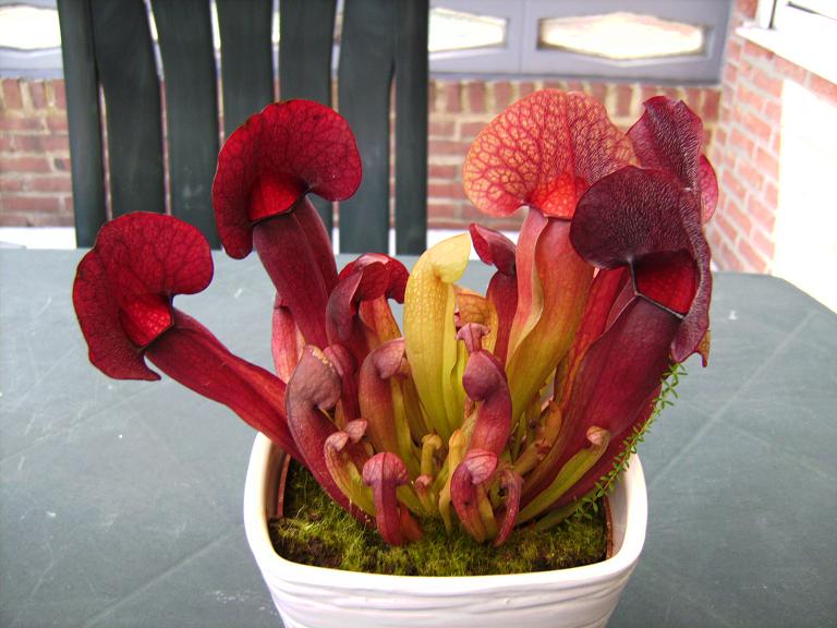 'k Wil geen roet in het eten strooien, maar wat er op de foto van Ger staat is geen Sarracenia purpurea ssp. purpurea. Het is een hybride waar o.a. purpurea in zit, en mogelijk nog een paar andere soorten, maar welke precies weet ik niet. De voorbije 20 jaar is er bijzonder veel gehybridiseerd geworden met Sarracenia's, en zijn er ook heel wat cultivars geselecteerd (waarmee dan ook weer werd gehybridiseerd). De vangbekers van de purpurea ondersoorten zijn praktisch liggend. In deze hybride zit duidelijk een soort met rechtopstaande bekers.