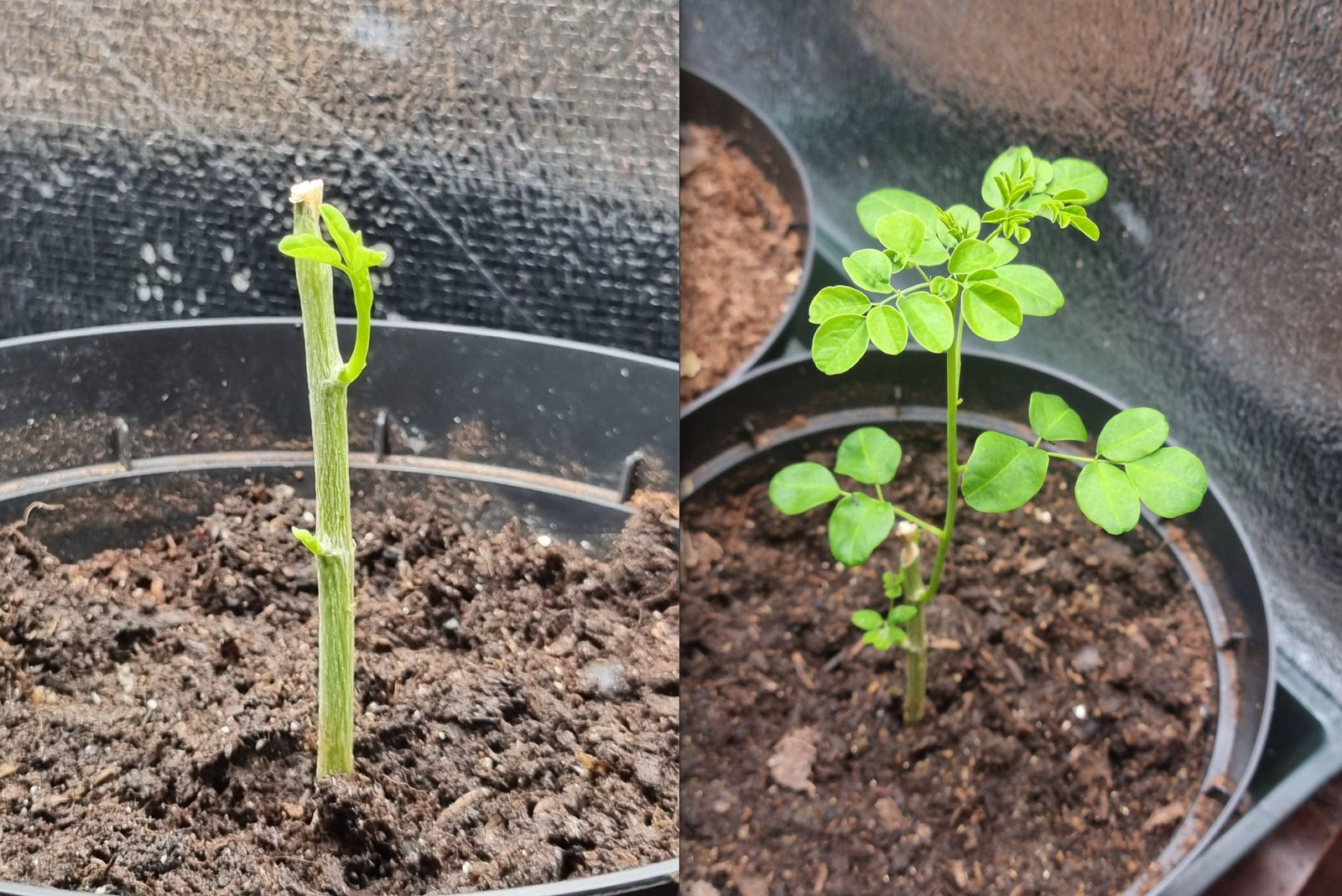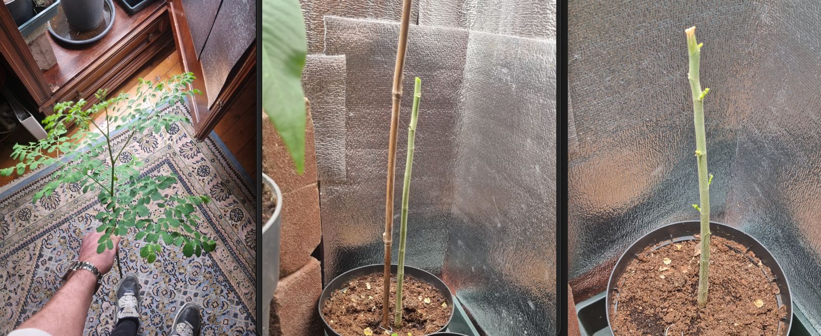 Mijn 3e Moringa die buiten mijn klimaatkast stond was helaas gevallen en daarbij is zijn wortelsysteem goed beschadigd geraakt. Weer snel terug in de pot gestopt, maar begon al snel slap te hangen, toen water gegeven waarna een opleving kwam.