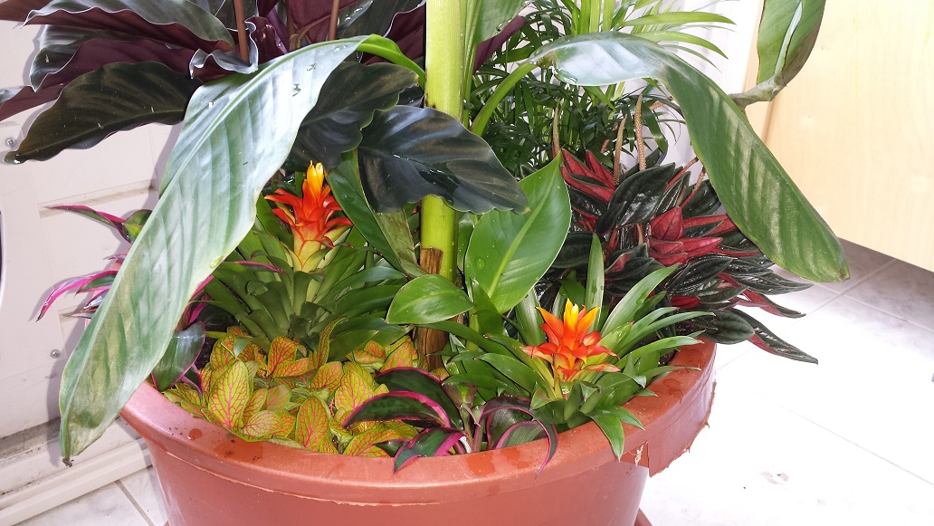 Ik ben een beetje door de winkel gelopen en een leuke hoeveelheid plantjes in de kar geladen om hier vervolgens thuis een soort van levend boeket van te maken. Het resultaat ziet er leuk uit vind ik (nu nog wel). De pot heeft er een erg tropische uitstraling door gekregen. Veel beter dan enkel die kale banaan in de pot.