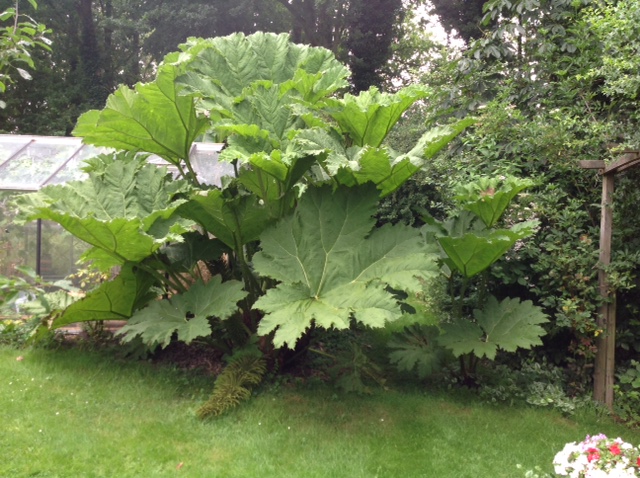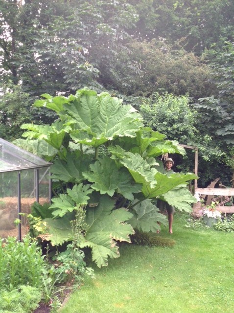 Dit monster in mijn achtertuin, hier in het hoge noorden van het land, wilde ik toch niet onopgemerkt laten. Deze (echte!) Gunnera Manicata(zelf noem ik hem liever REUZErabarber) heb ik in 2012 in de tuin gezet. Toen paste hij nog in een vuilniszak achter op de fiets. De eerste foto is van 2013. Daar was hij ongeveer anderhalve meter hoog. Nu, twee jaar later, mag de reusachtigheid duidelijk zijn. Ik ben 1,80 ter vergelijking op de foto. De totale hoogte van de plant is bijna 4 meter. De hoogste bladstengels zijn ruim 2 meter en de bloemen waren dit jaar 2 meter hoog. Het zijn inmiddels 3 hoofdstammen met enkele uitlopers er omheen. De totale breedte op de foto is meer dan 5 meter! Ieder jaar kijk ik weer vol verbazing hoe al dit geweld binnen twee maanden vanaf grondhoogte omhoog komt. Tot nu toe wordt hij ieder jaar groter. Inmiddels is de plant ook stukke groter (meer dan een meter hoger) dan de moederplant waar deze vanaf komt. Gelukkig heb ik alle ruimte in de tuin, want deze omvang had ik verre van verwacht.