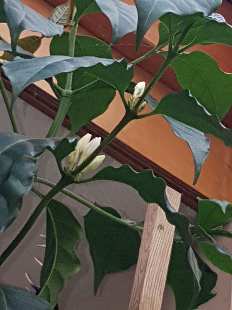 Hierboven de top van de plant. Het ziet er wat iel uit, dat vanwege mijn gesnoei. Nu ik hem weer eens goed bekeken heb herinner ik mij waarom ik zo gesnoeid heb. De plant zat vol met wolluis. Die plaag is vrijwel niet te bestrijden, vooral niet op een koffiestruik. De bast is nogal schilferig en daar verschuilen zich hele luizenkolonies onder. In een blad las ik het advies een aangetaste plant maar weg te gooien en een nieuwe aan te schaffen. Misschien doe ik dat wel. Wat moet je eigenlijk met een koffieplant?