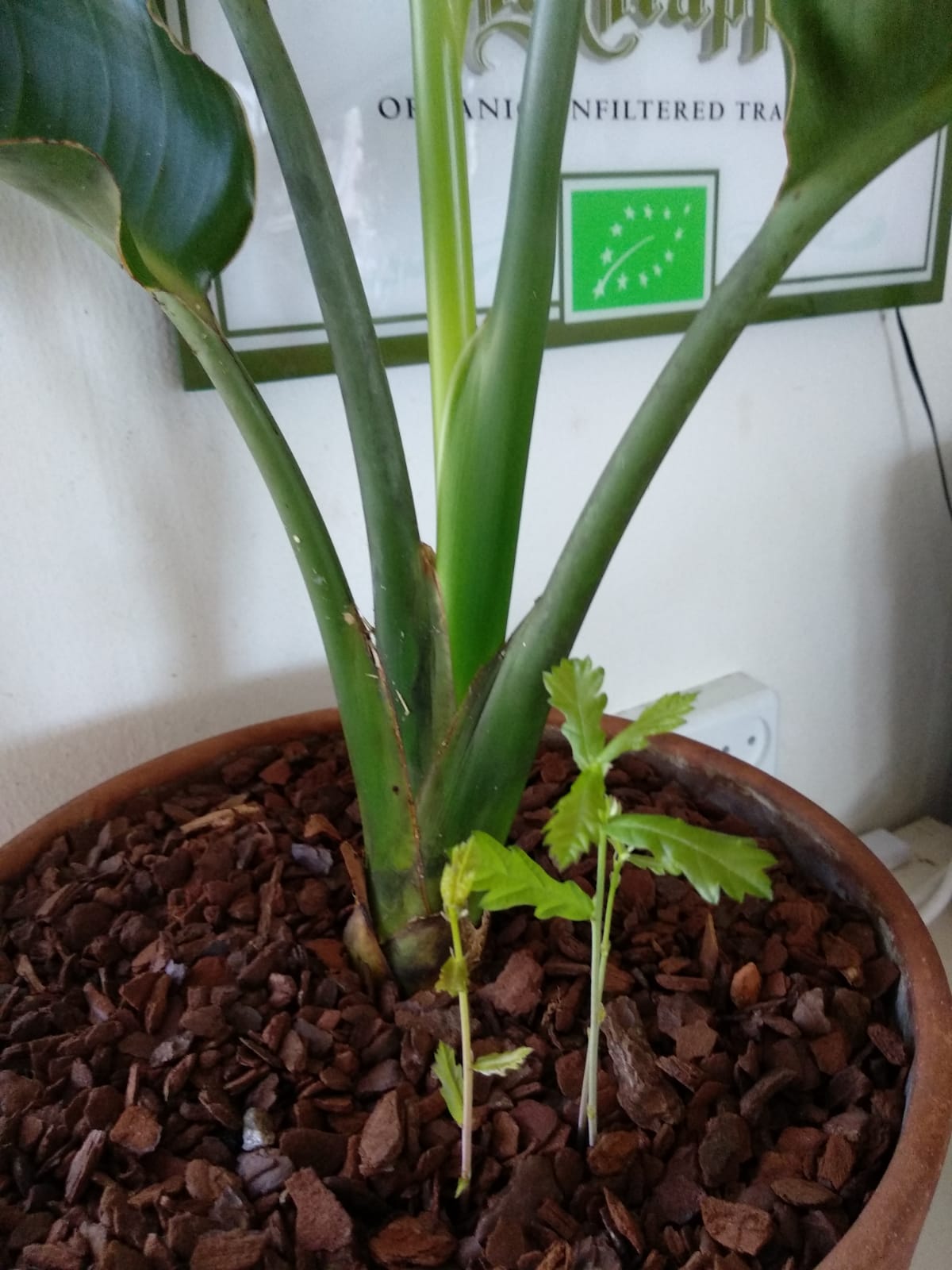 Bij mijn Strelitzia komen nu voor de derde keer dit soort blaadjes omhoog, tot nu toe heb ik die weggehaald omdat het blad eerder lijkt op zaailingen van een eik, dan van de strelitzia.