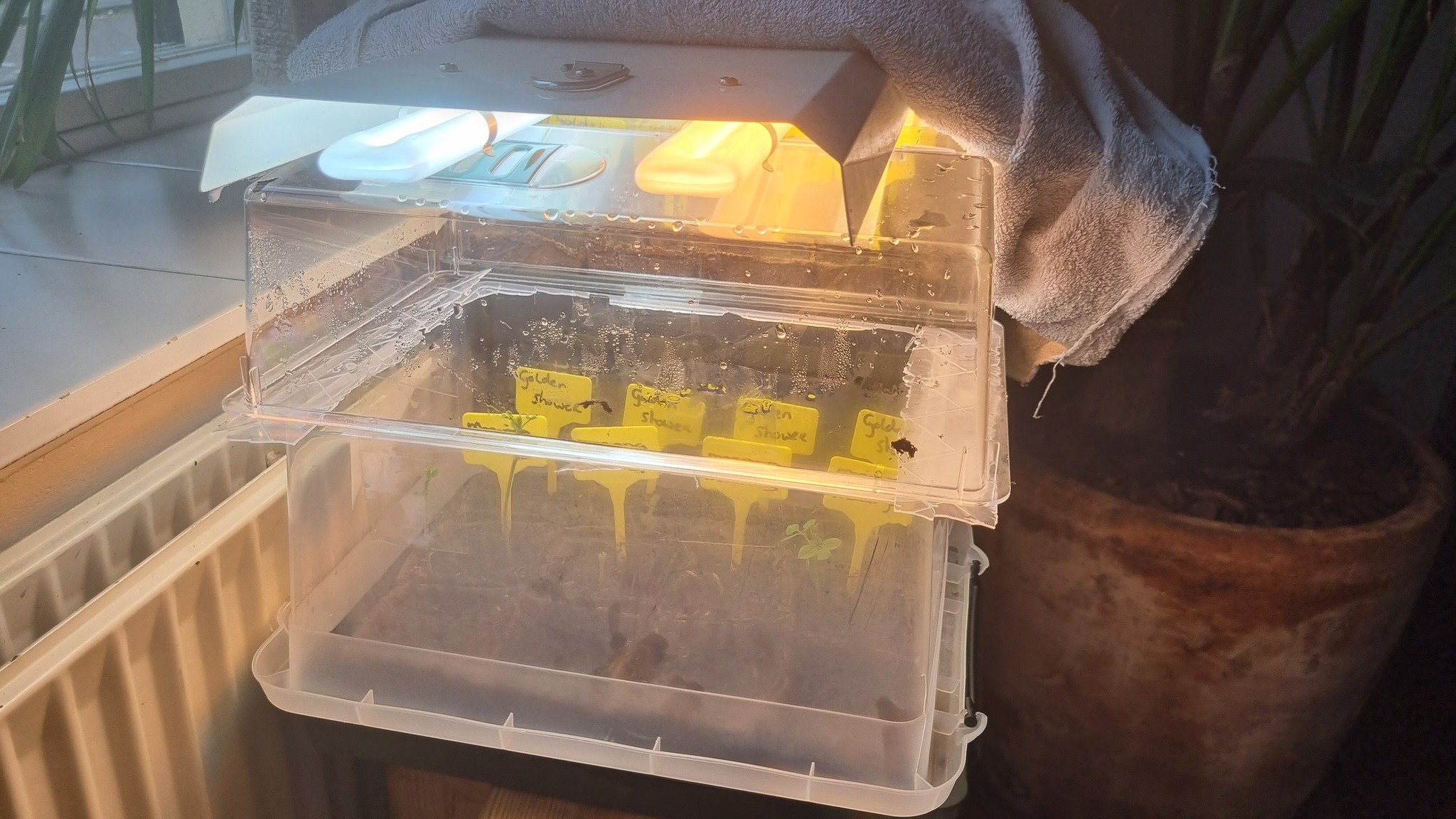 Voor het zaaien en stekken heb ik weer wat anders gefabriceerd. Een oud aquarium met een glasplaatje er op om de luchtvochtigheid vast te houden en een kastje met een verwarmingsplaatje er onder voor bodemwarmte.
