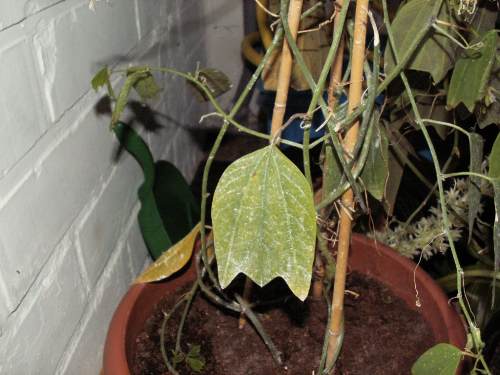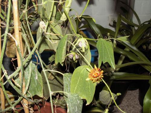 ) Hij deed het heel goed. Ik heb hem naast mijn andere passiflora gezet tegen de muur in de tuin. Lekker beschut tegen veel wind en regen en toch in de namiddag wat zon (als ze schijnt). Nu begint deze plant zijn bladeren te verliezen en worden ze geel. De zaaddoosjes vallen gelukkig nog niet af. Zelfs de jonge bladeren hebben dit. De nectarklieren in de bladeren worden bruin. Gebeurd dit omdat het kouder wordt of is hij ziek (hij verblijft momenteel in de kelder - te koud 's nachts - veel licht en momenteel een temperatuur van 17 graden) . Er zitten geen bladluizen of spint op. Mijn andere passiflora heeft dit niet. Hij is gezond.