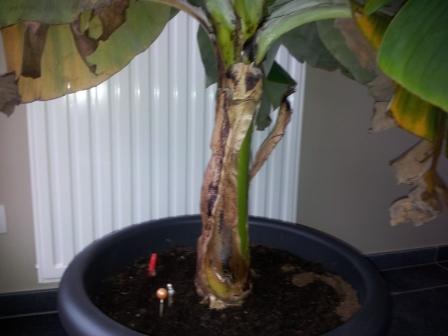 * De onderste bladen worden altijd bruin en dor. Vroeger knipt ik die af maar dan droogte de hele lengte tot aan de grond gewoon af. Nu laat ik ze gewoon hangen. Wat doe je daarmee? Want als je ze afknipt dan kan je stam toch niet verdikken??