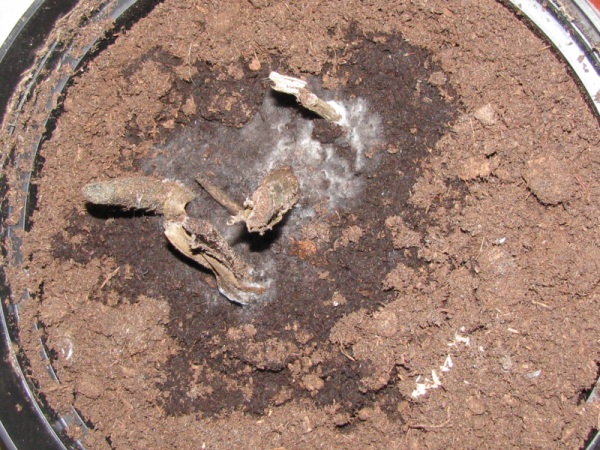 Vorige week heb ik knollen van de Canna brasiliensis gekocht. Ik heb deze in potgrond gezet en geen water gegeven. Gisteren heb ik deze toch een beetje water gegeven. De eerste ziet er nog goed uit maar de ander heeft een wit schimmeltje :(