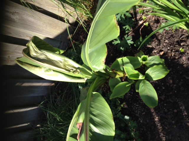 Een nieuw blad van gisteren, dat er nog heel goed uitzag is vandaag veranderd in een slap en verschrompeld blad. Ik heb gisteren nog een flinke emmer water gegeven (totaal ca. 8 liter), echter staat de Musa op een plek waar het water vrijwel direct in de grond verdwijnt. (iets te veel drainage aangebracht?)