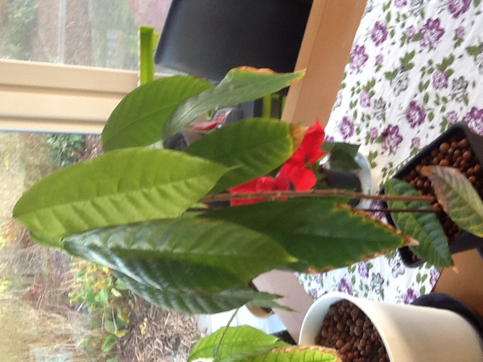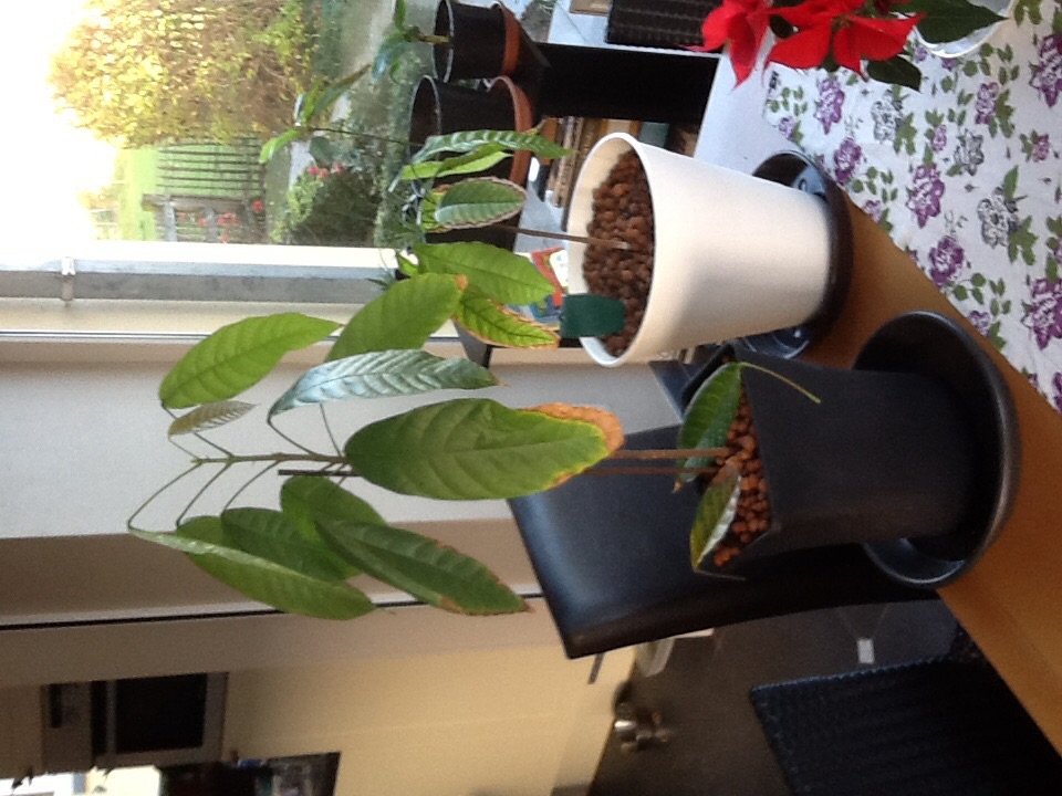 Mijn cacaoboompjes hebben geringe tijd last van een verkleuren blad die naar verloop van tijd afvalt. Voornamelijk de onderste exemplaren hebben er last van. Het probleem begint met het lichtbruin kleuren van het bladpunt en trekt zo langs de zijkanten omhoog met een gele rand. Ook zijn er necrotische vlekken te zien. Mijn ene boom heeft er beduidend meer last van dan de andere.