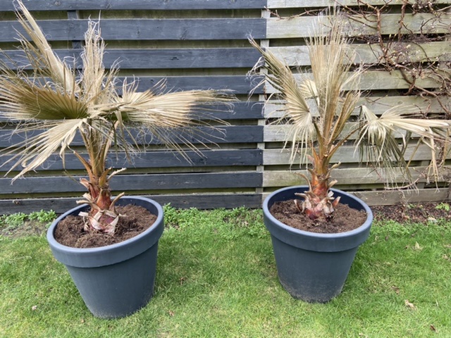 PS: mocht je opnieuw twee palmen zetten, kies dan liefst een binnenpot, of boor gaten onderin. Is wel zonde van die fraaie potten, maar niet afwaterende potten is ook een 100% garantie op dode planten!