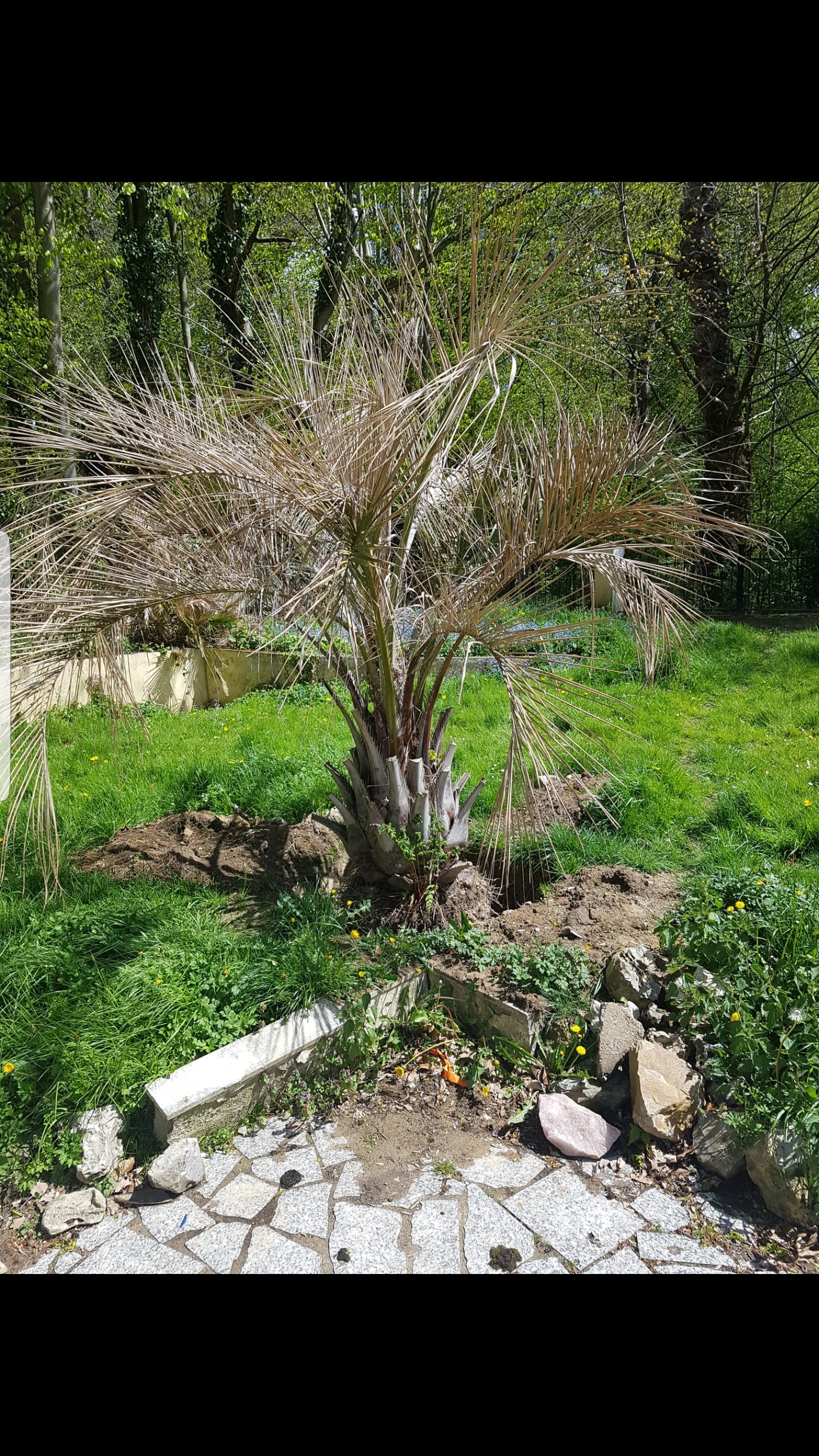 Op dit moment heb ik zelf 4 palm bomen in de tuin die er goed bij staan en nu heb ik het aanbod gekregen om een nieuwe palm in de volle grond te zetten maar ik weet niet of deze nog te redden is, ik zie dat er wel nog groen aan de stengels zit maar grote deels zijn deze bladeren bruin uitgeslagen omdat ze de wortels hebben uitgegraven.