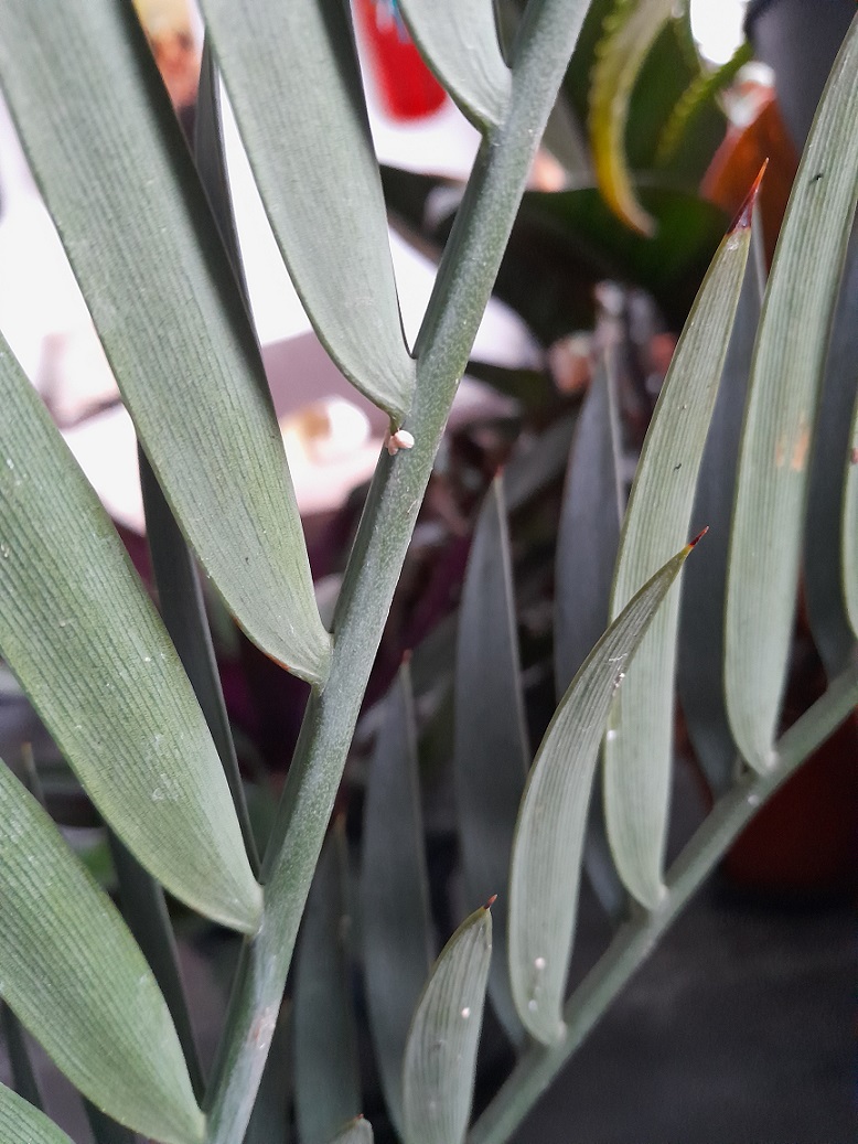 Mengsel maken voor een sproeibeurt en een beetje mengen met 3hoek vloeibare zeep dan bind het beter met het lauwe water, plant buiten zetten uit de zon en kompleet nat sproeien onder en bovenkant blad stelen, voet en kluit, het ruikt een beetje! Na enkele uren als het opgedroogd is kun je de plant weer binnen plaatsen door het waslaagje stikken larven en eitjes