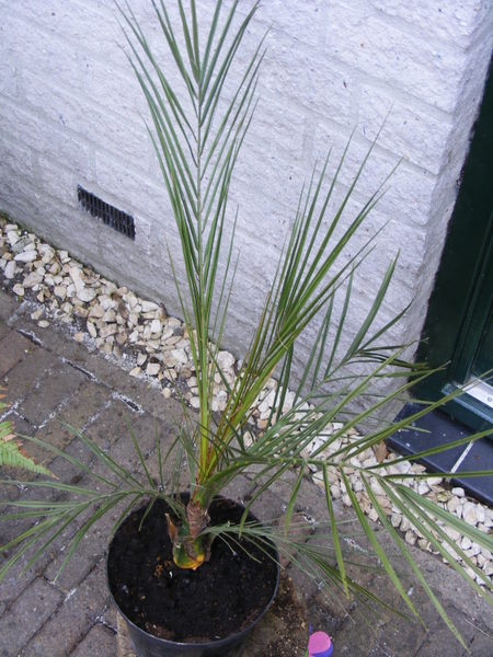 Ik heb de palm verpot naar betere grond, potgrond, op bodem wat keitjes en wat koemest korrels.