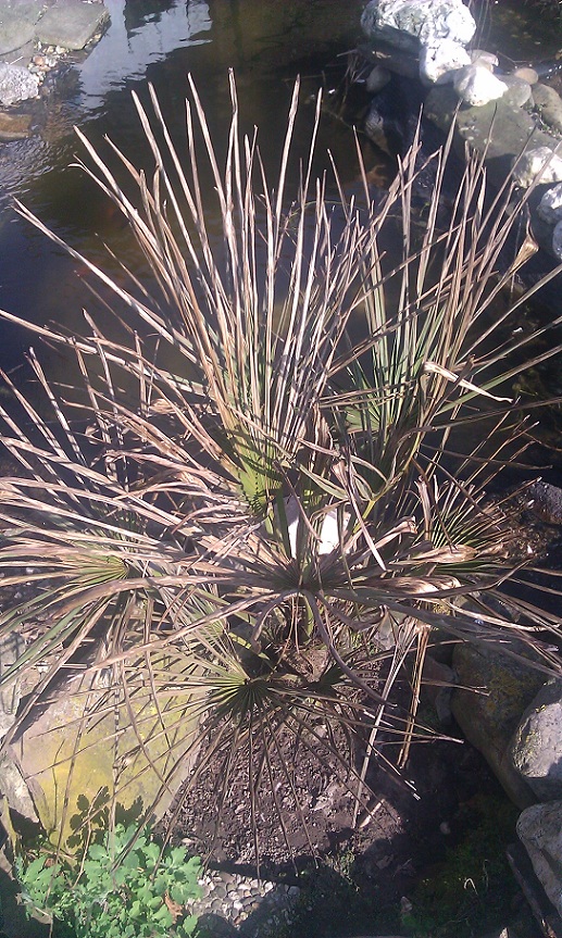 Ook vraag ik me af of mijn schade enkel door de vorst komt of dat er een andere oorzaak is? Ik zie namelijk bij andere palmen dat de bladeren halverwege slap gaan hangen op dit forum en bruin zijn geworden tot de helft, maar niet verschrompelt oid.