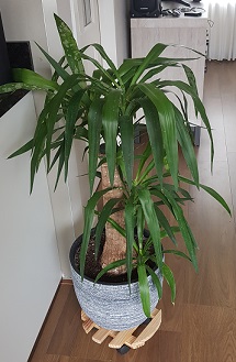 Hmm, deze plant staat veel te donker voor een yucca. Hoewel Yucca best donker kan overleven is het gevolg dat het blad lichter en vooral heel slap wordt. Zet de plant in de zomer buiten of in ieder geval voor een zonnig raam en je krijgt een veel gezondere plant. Maar ga nu in ieder geval niet stunten met watergeven. Deze plant heeft maar weinig nodig. De grond mag helemaal opdrogen tussen de gietbeurten door. En daarbij is je vinger idd het beste meetinstrument.