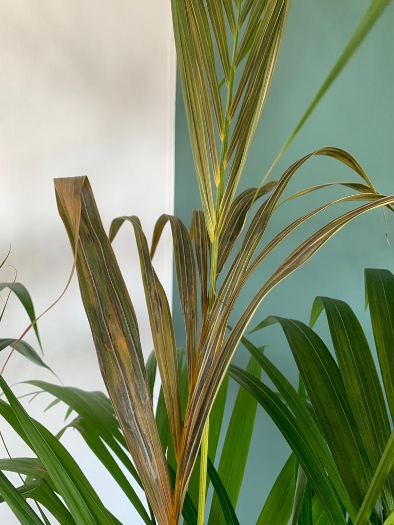 Ik heb in januari een prachtige Kentia palm van 2.5 meter gekocht. Nu merk ik dat de groei van de bladeren stagneert en er een aantal bladeren afsterft. De stengels zijn bruin (zie foto).