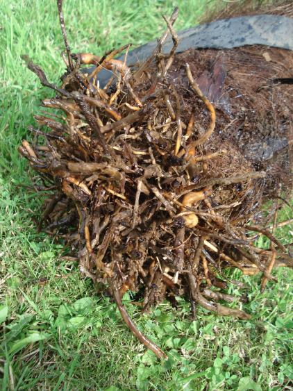Je ziet op bovenstaande foto ook hoe weinig wortels er zijn t.o.v. van het formaat palm.
