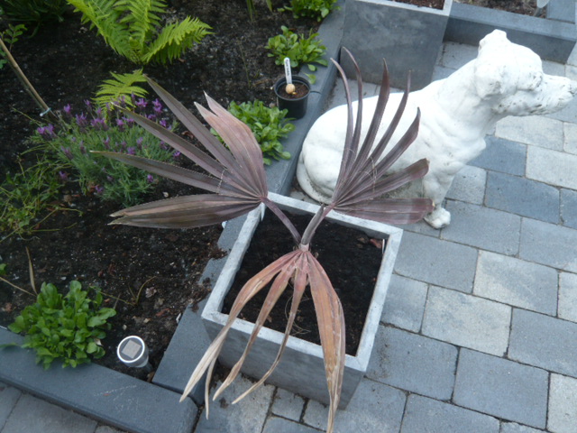 De rood paarse verkleuring bij een Bismarckia wordt volgens mij meer veroorzaakt door koude. De Roebelinii is in vergelijking met Bismackia gevoeliger voor zonlicht. Maar kan hier ook prima aan wennen!