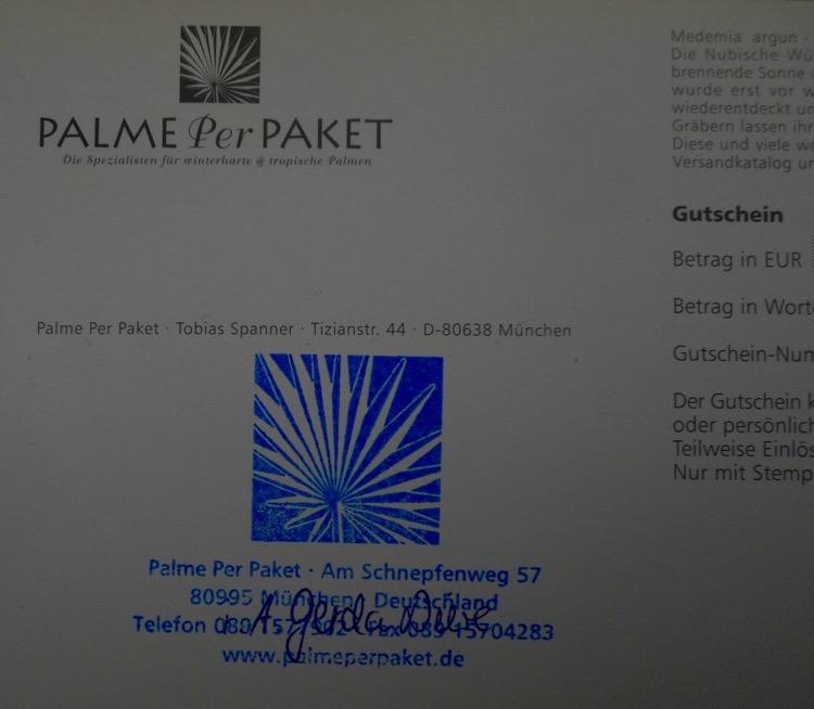 Na enige discussie over en weer met Palme Per Paket over de mogelijke oorzaak van de bladschade bij de geleverde nikaupalmen, kreeg ik het aanbod om de palmen retour te zenden waarop ik nieuwe zou ontvangen. Vanwege de extra kosten en rompslomp die dit met zich meebrengt, was mijn tegenvoorstel om mij een 'Gutschein' toe te kennen, een tegoed dat ik bij een volgende bestelling kan inwisselen. Dat is gehonoreerd :thai: