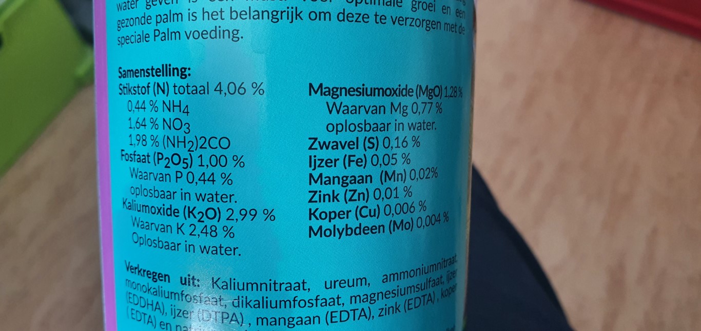 Krijgt sinds 2 maanden nu Palm voeding (ipv gewone algemene planten voeding) van merk Wilma's Lawn & Garden. Deze werd aanbevolen (iemand ervaring mee?). Hierin zit wat hoger Stikstof (N), Fosfor (P) verhouding. Dit zou beter heb ik ergens gelezen.(Klopt dit?) (zie afbeeldingen)