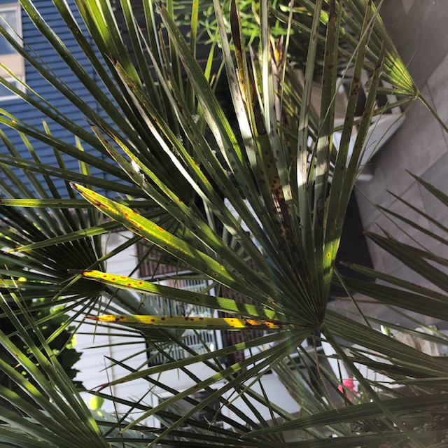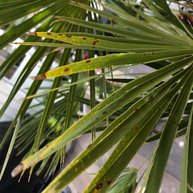 Zitten de spots op alle bladeren of alleen op de oudste. Het is niet ongewoon dat oud blad aftakelt in het groeiseizoen. Het kroonvolume met vitale bladeren blijft doorgaans vrij constant. Die bruine vlekken kunnen geen kwaad en zijn alleen ontsierend. Als de palm voldoende gezonde bladeren heeft, kun je desgewenst de lelijke exemplaren afknippen.
