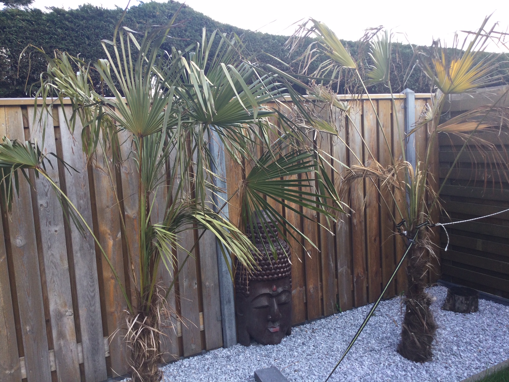 Vorig jaar augustus heb ik 3 palmen overgenomen van iemand die ze in een kas in de open grond had staan. De stamhoogte is 1 meter hoog. ik heb ze toen goed vochtig en nat gehouden in de afgelopen zomer. Nu na de winter zijn de bladeren wat geler geworden.