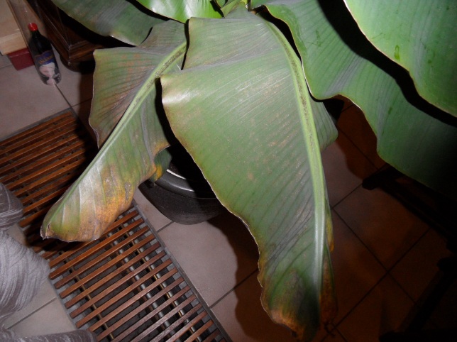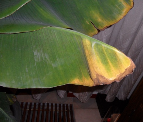 Ik heb nu ongeveer een half jaar een musa dwarf cavendish in de huiskamer staan, voor een raam op het zuiden. Sinds ongeveer een week beginnen de randen van sommige van de bladeren te vergelen en sommige bladeren zijn er schimmelig uit gaan zien. Weet iemand wat hier de oorzaak van is? Ik heb een drietal foto's gemaakt.