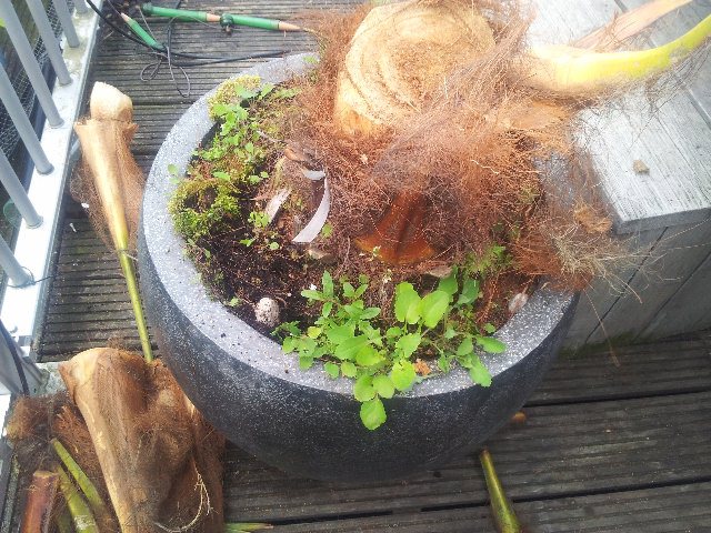Helaas heeft een van mijn trachy's de winter niet overleefd. Met pijn in mijn hart probeer ik hem nu uit zijn grote pot te verwijderen. Helaas loopt de pot iets taps toe aan de bovenkant (boven smaller dan onderen). Ondanks dat het niet warm is, heb ik vandaag al behoorlijk lopen te zweten, want heb geen idee hoe ik de palm+wortels uit de pot krijg. De hele aarde is een grote wortelstelsel waar ik haast niet doorheen kom. Kom ook niet met gereedschap onder de palm om wortel kapot te steken. Nee, de pot wil ik (voorlopig niet) kapotmaken. Heeft iemand dit vaker gedaan en een tip hoe ik de restant van de palm eruit krijg. Ik realiseer me dat deze vraag in geeneen topic / foum past. Dus probeer het maar hier.....