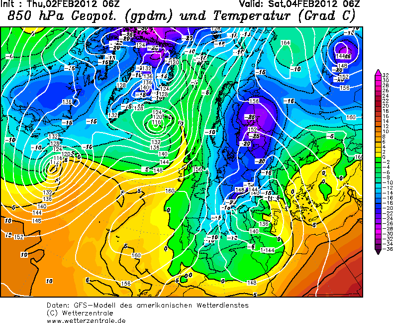 Hier een voorbeeld kaart met de bovenluchttemperaturen op zaterdagochtend. Dit gaat geheid met een sneeuwdek en wegvallende wind diepvriestemperaturen opleveren. Deze situaties hebben in de afgelopen winters met zelfs hogere bovenluchttemperaturen, temperaturen van -15/-20 aan de grond opgeleverd. Uiteraard gebeurde dat wel in de December en Januari maanden, maar toch.