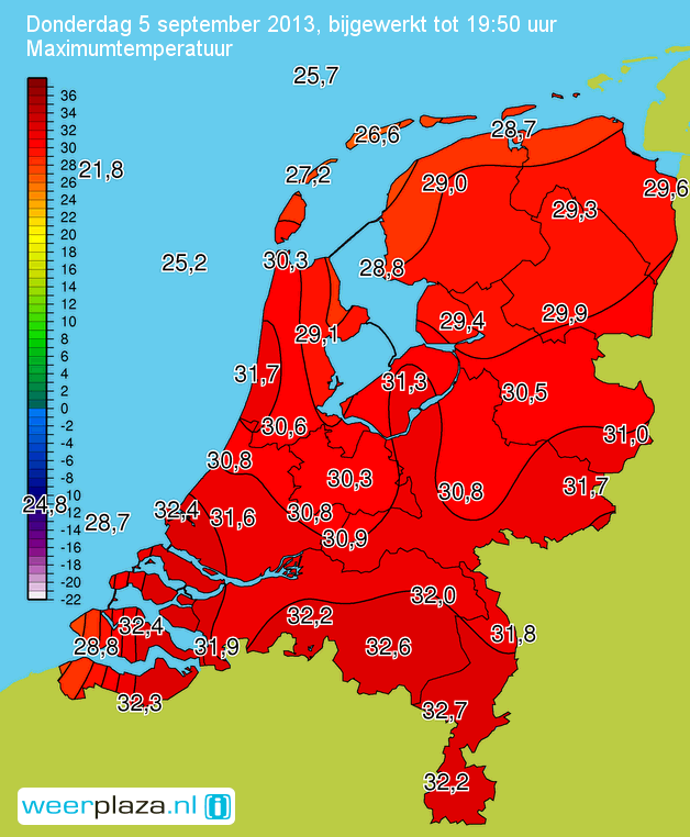 Vandaag extreem hoog voor september, men verwacht 31ºC. morgen nog een keertje 30ºC. en dan weer terug naar normale temperaturen :fluiten:
